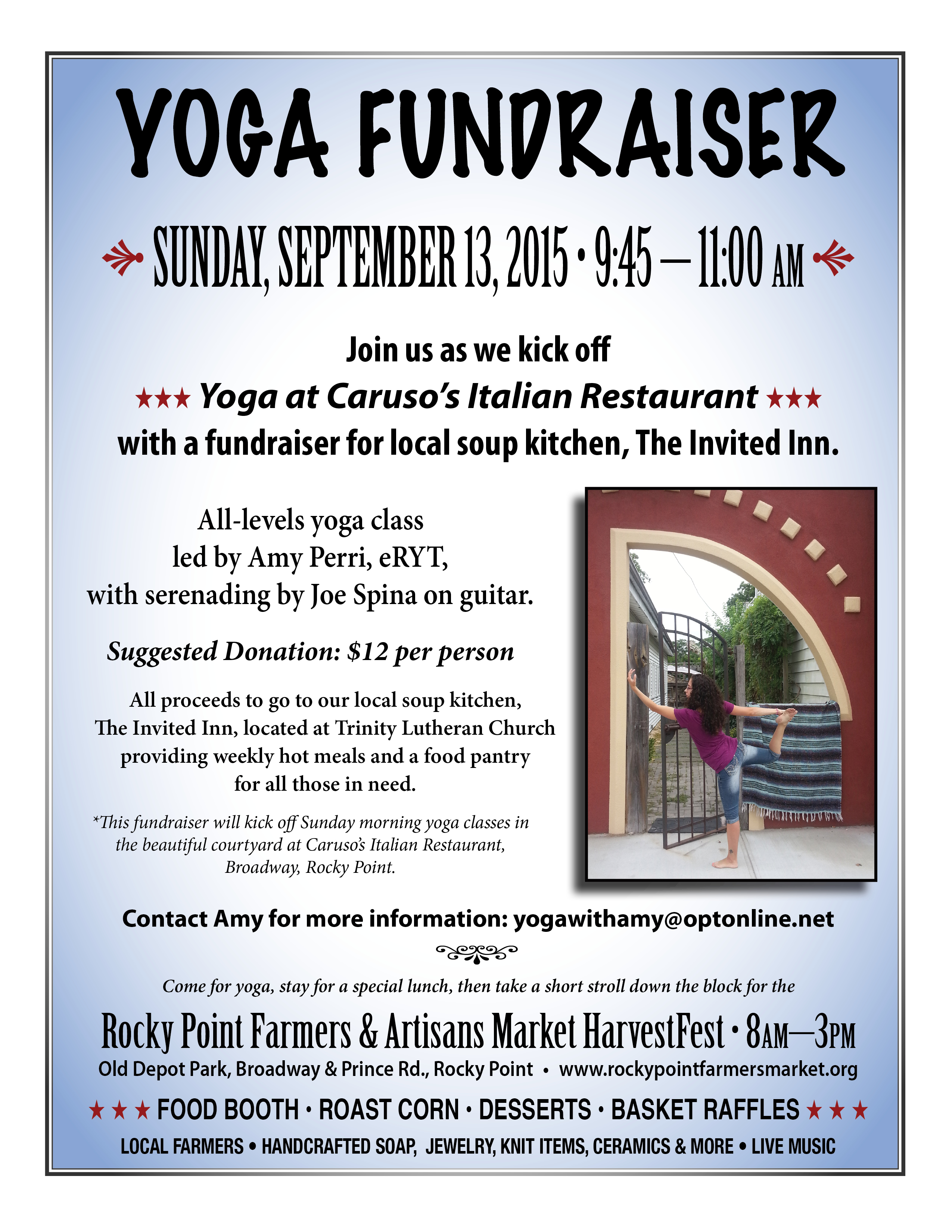September 13th Yoga Fundraiser at Caruso’s Restaurant in Rocky Point kicks off Sunday Morning classes for the Fall!